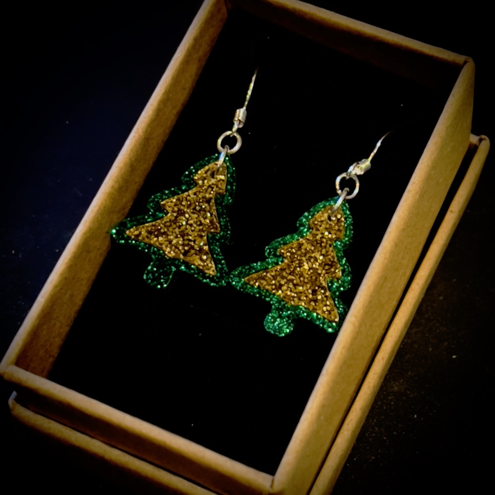 Cute  glitter acrylic earrings in red/green, silver/green or gold/green. Tree is 25mm long.