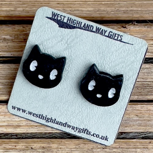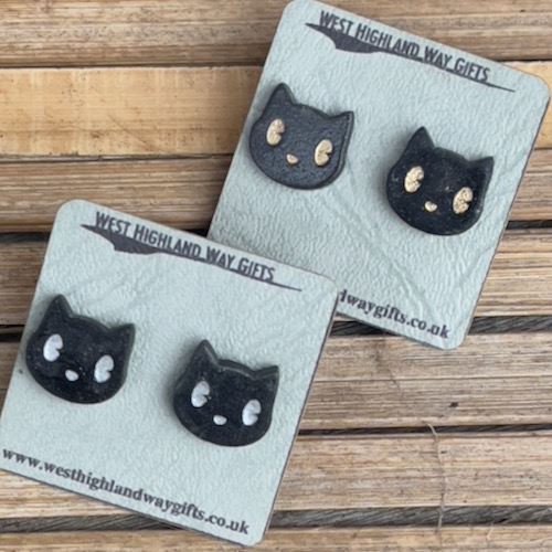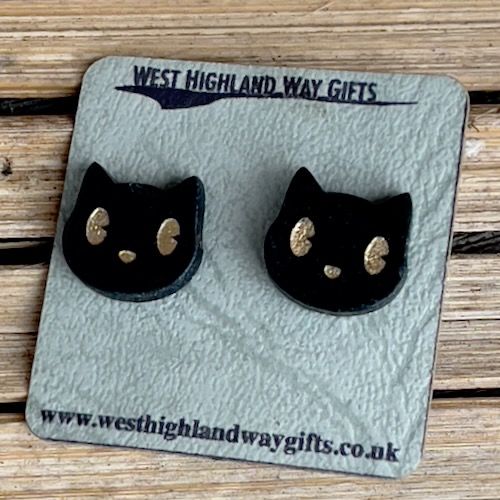 Cute ‘kitty-face’ stud earrings. Approx 1.5cm – black acrylic with highlights in silver or gold