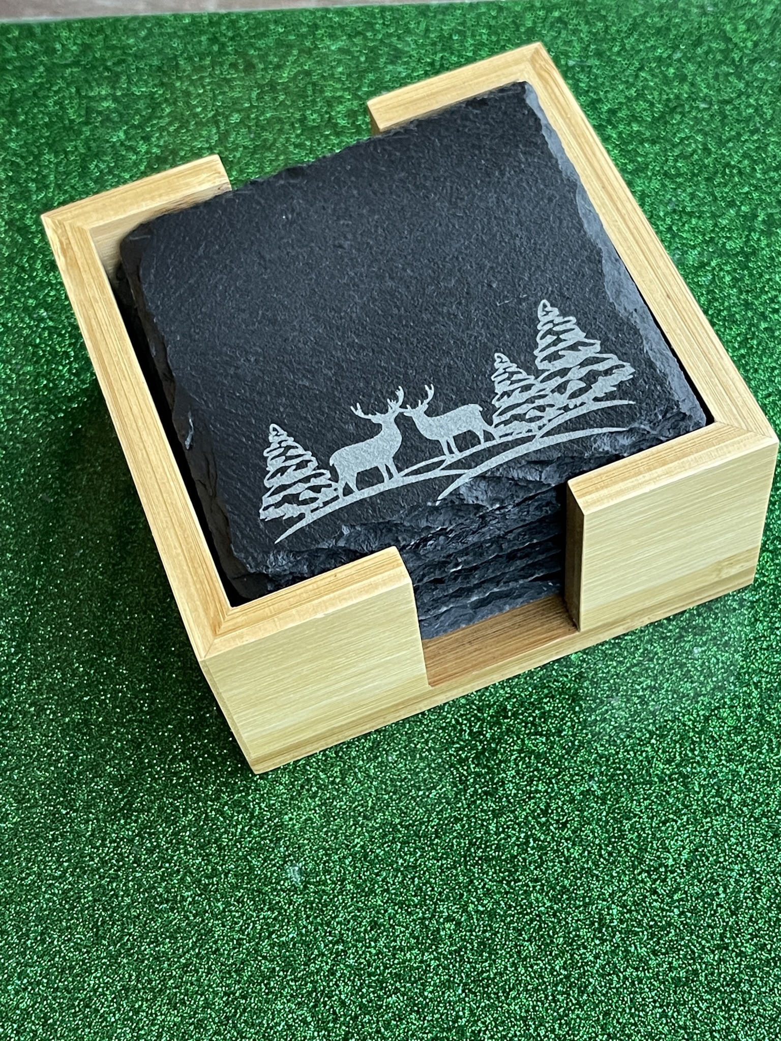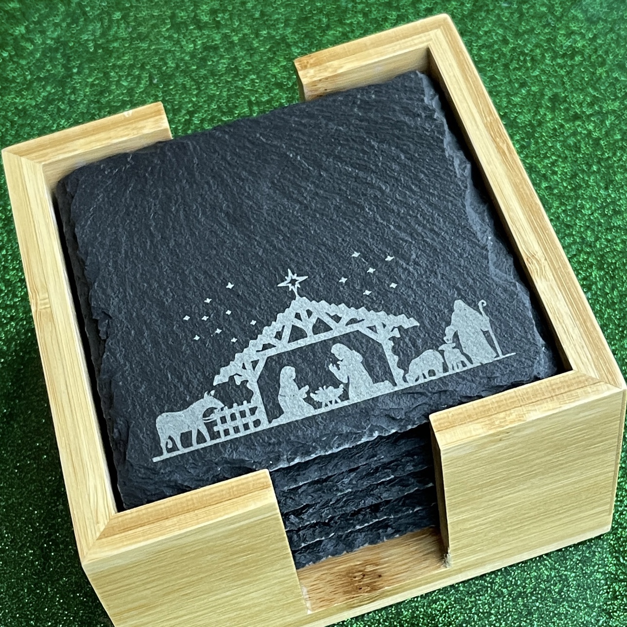 Set of six square slate coasters (10cm x 10cm) with soft padded feet in bamboo box. Choice of nativity or winter scene.