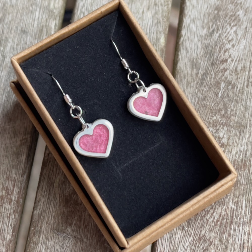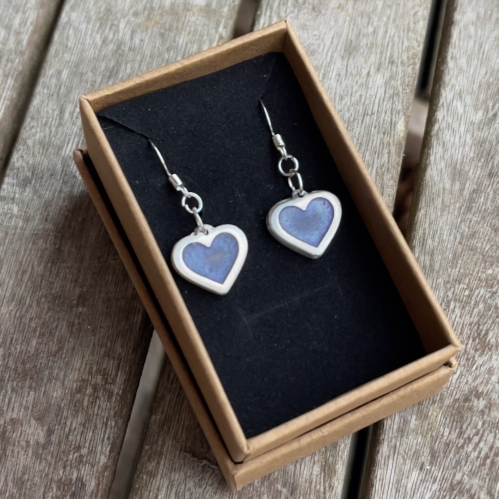Handmade pewter and green, purple or red epoxy heart-shaped earrings.