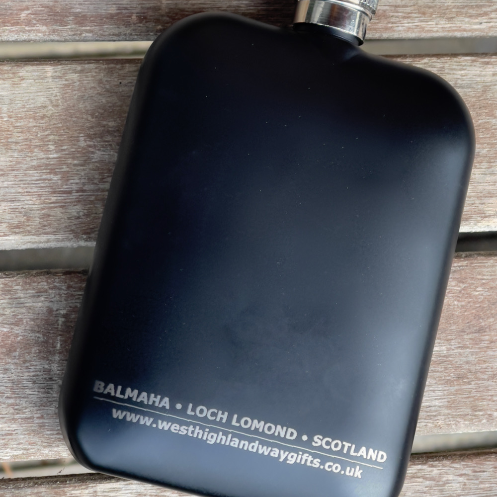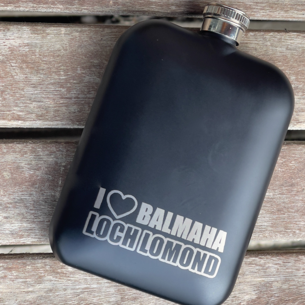 Matt black 6oz/150ml stainless steel flask with screw on cap. Silver ‘I Love Balmaha, Loch Lomond’ graphic on front. “Balmaha • Loch Lomond • Scotland” on back.