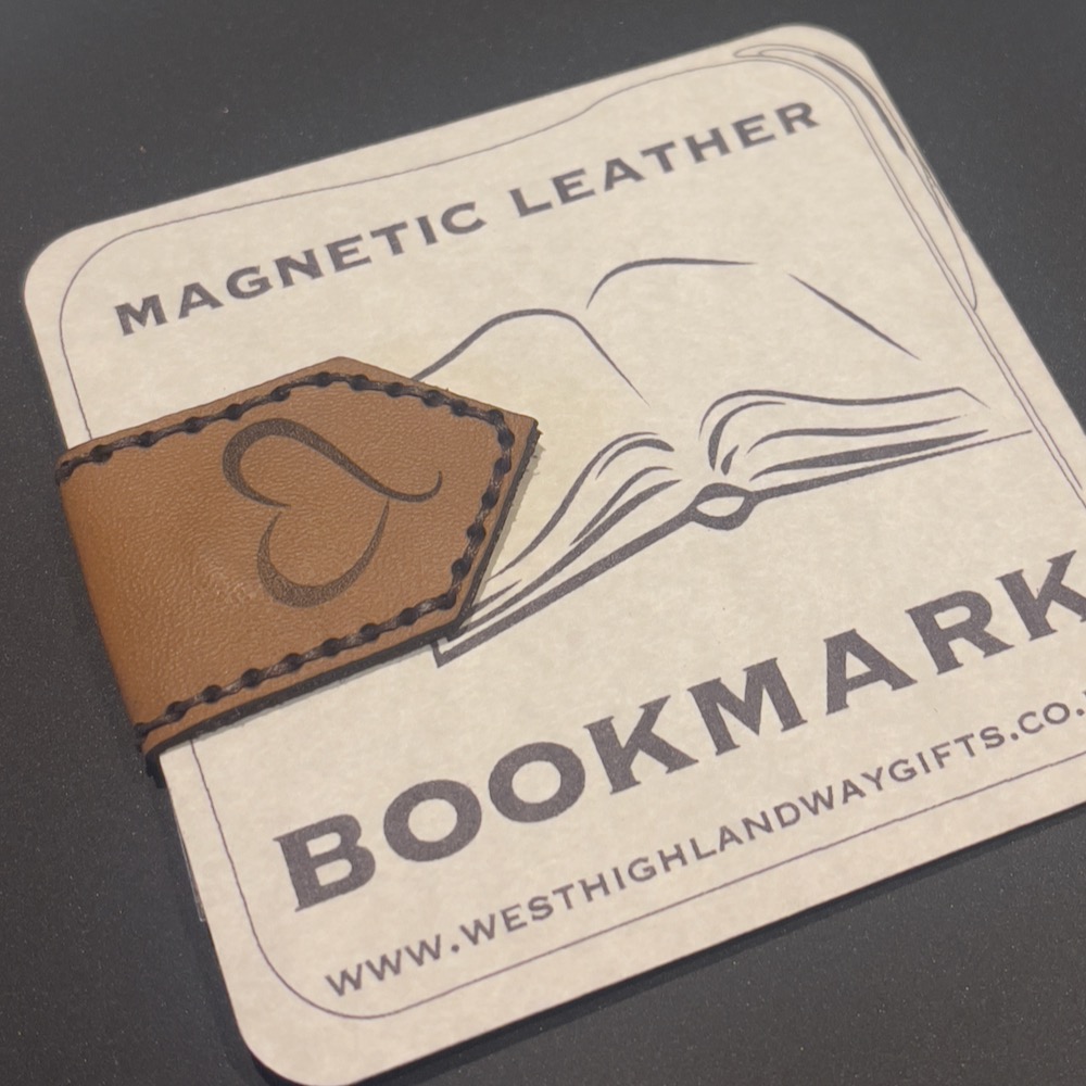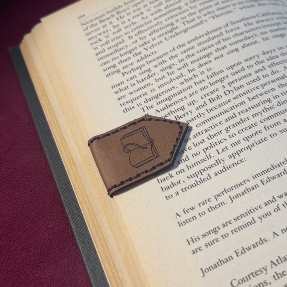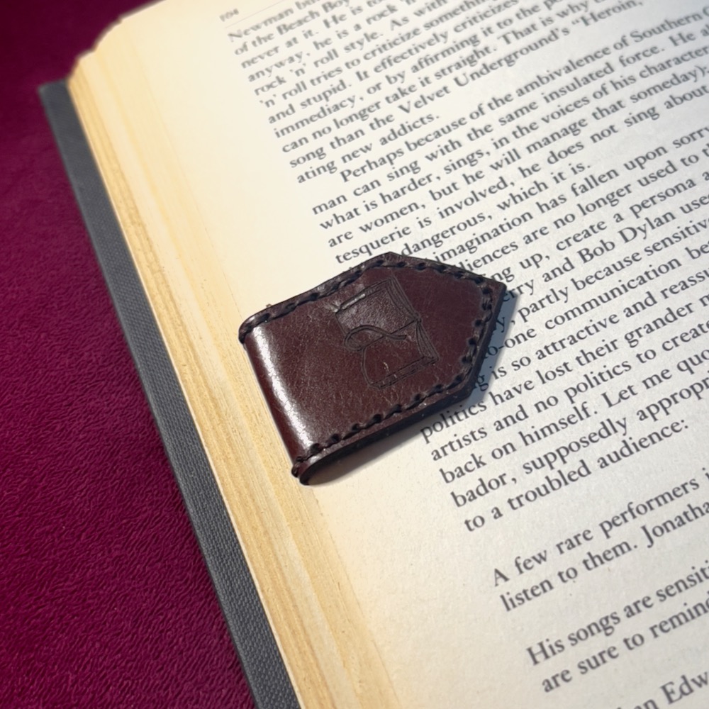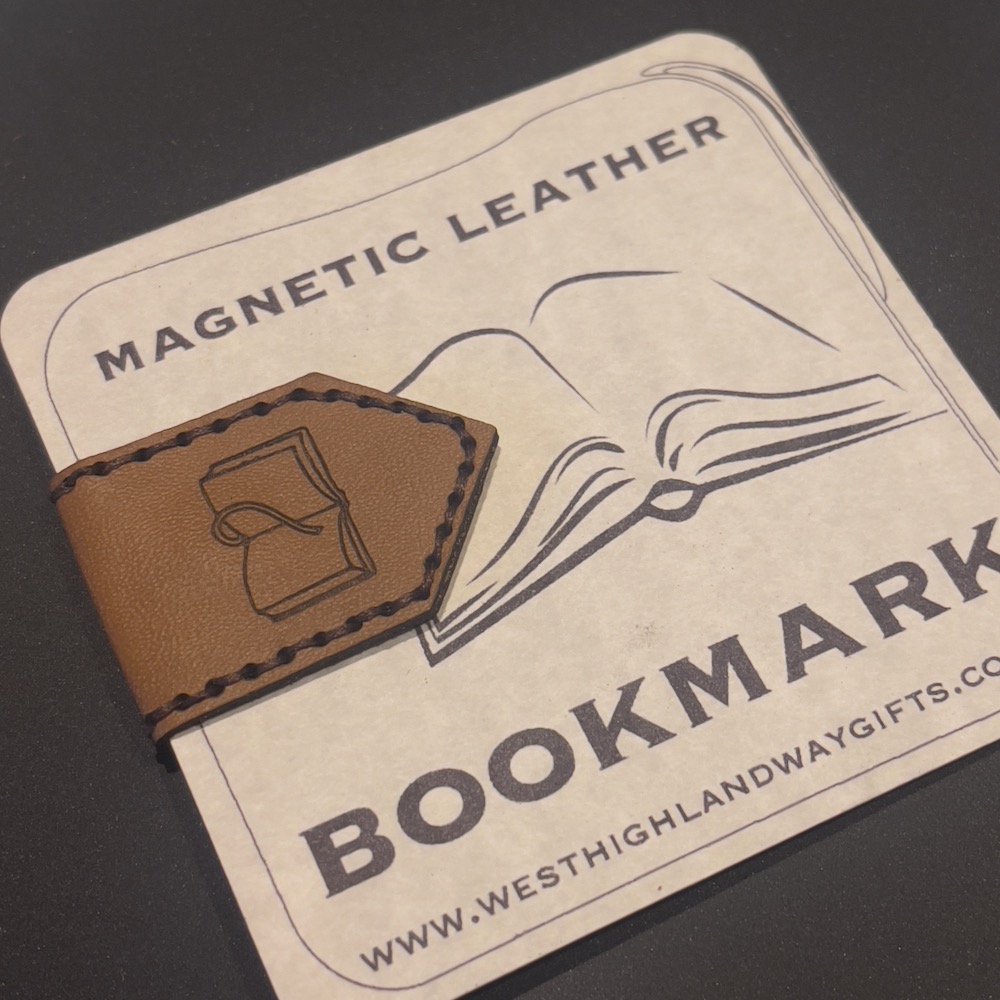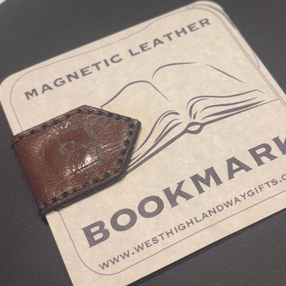 Hand-stitched magnetic leather bookmark – light or dark brown.