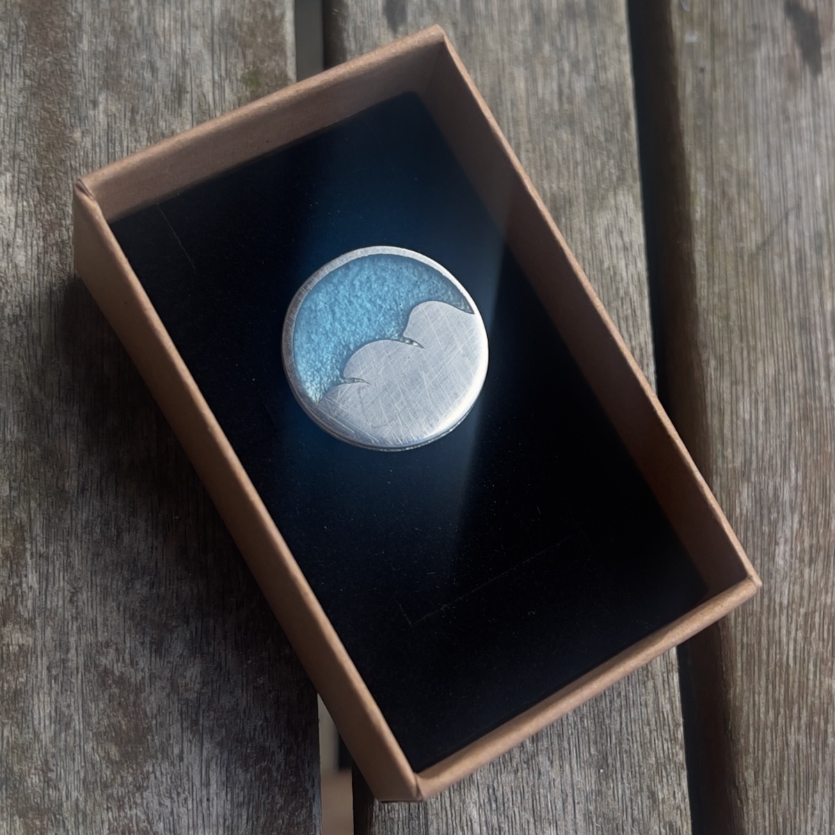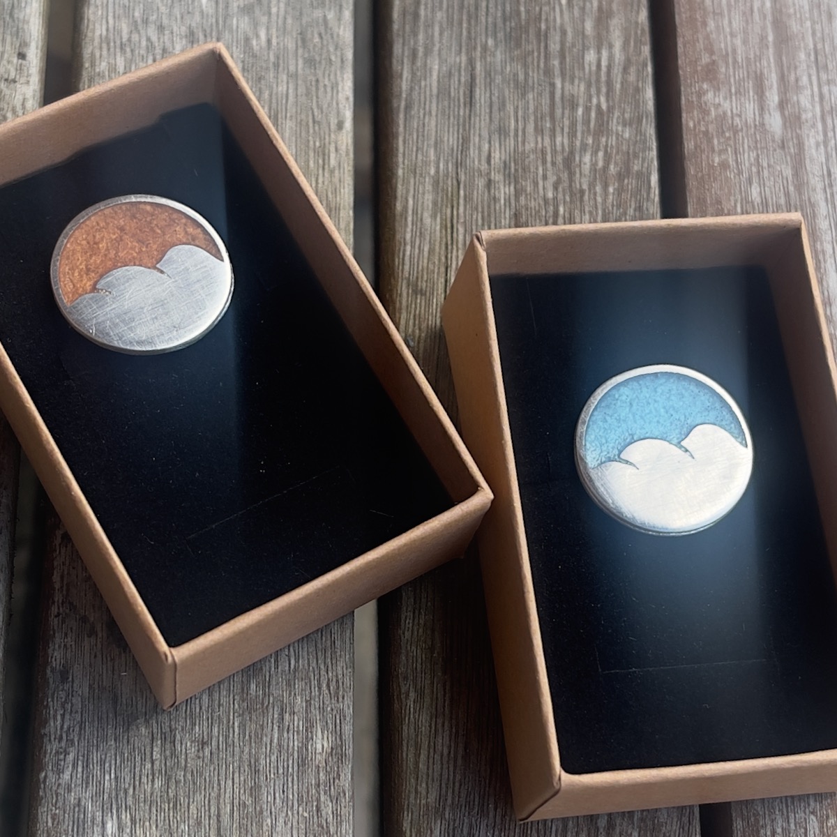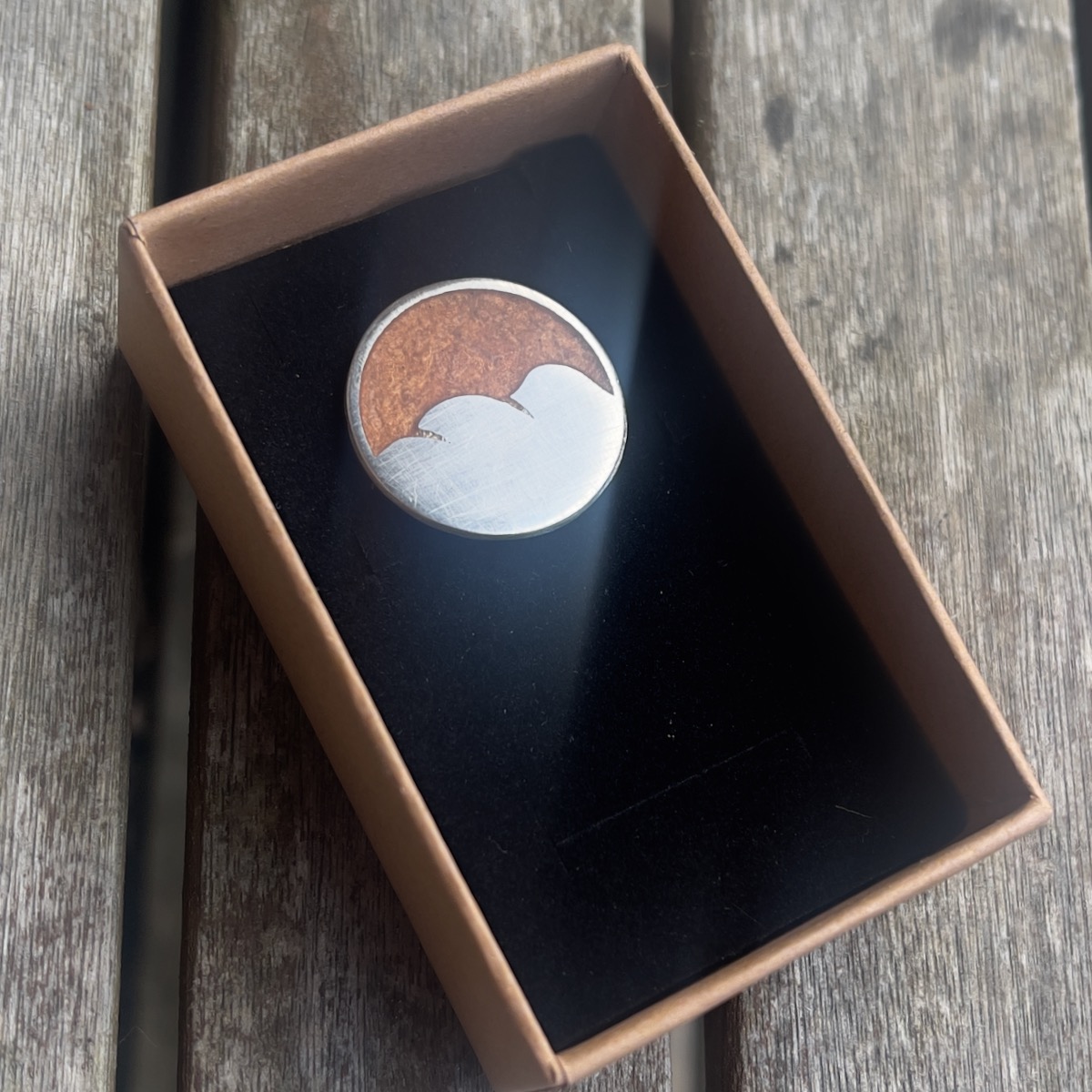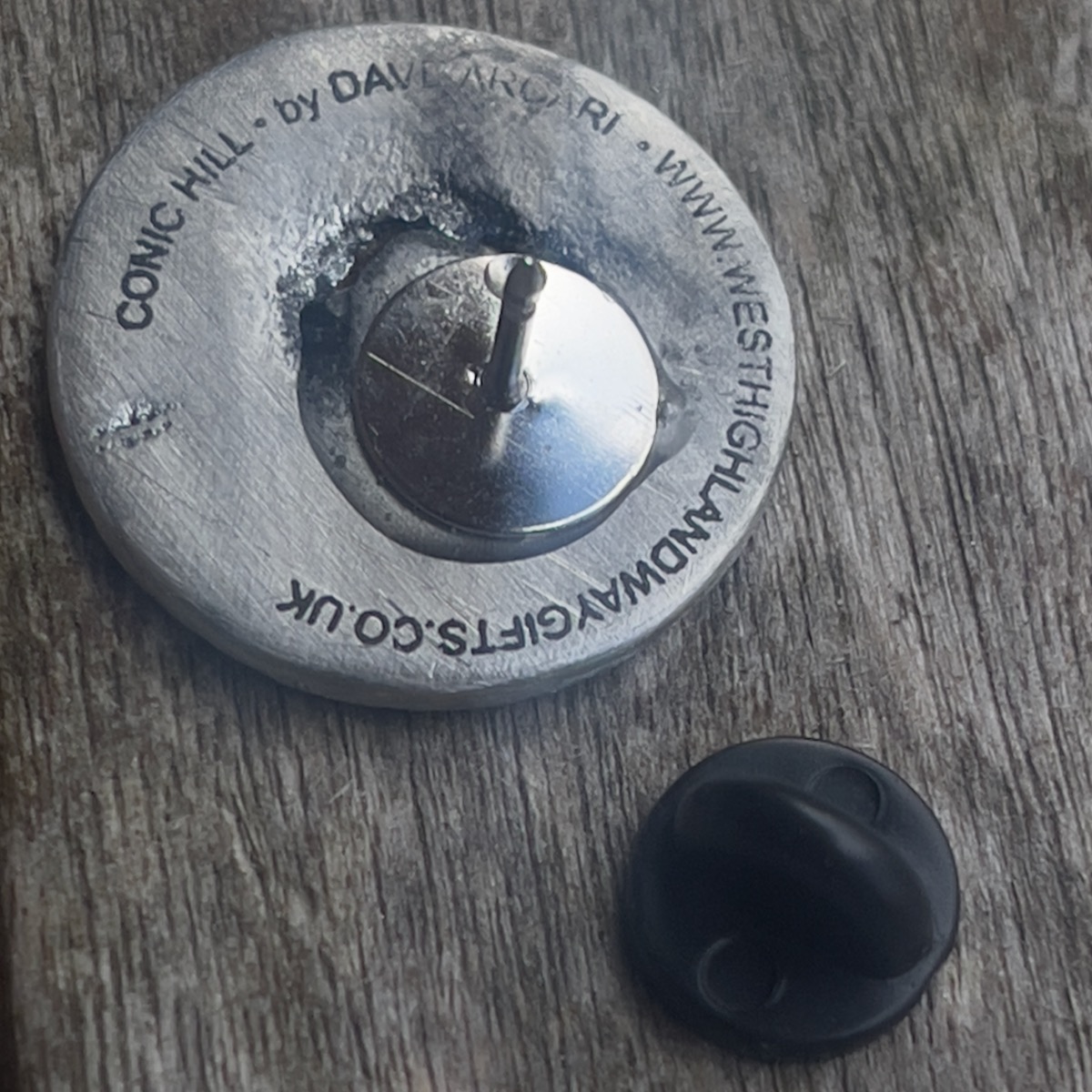 HAND-made Conic Hill brooch/pin. Pewter and epoxy with butterfly clasp on back.