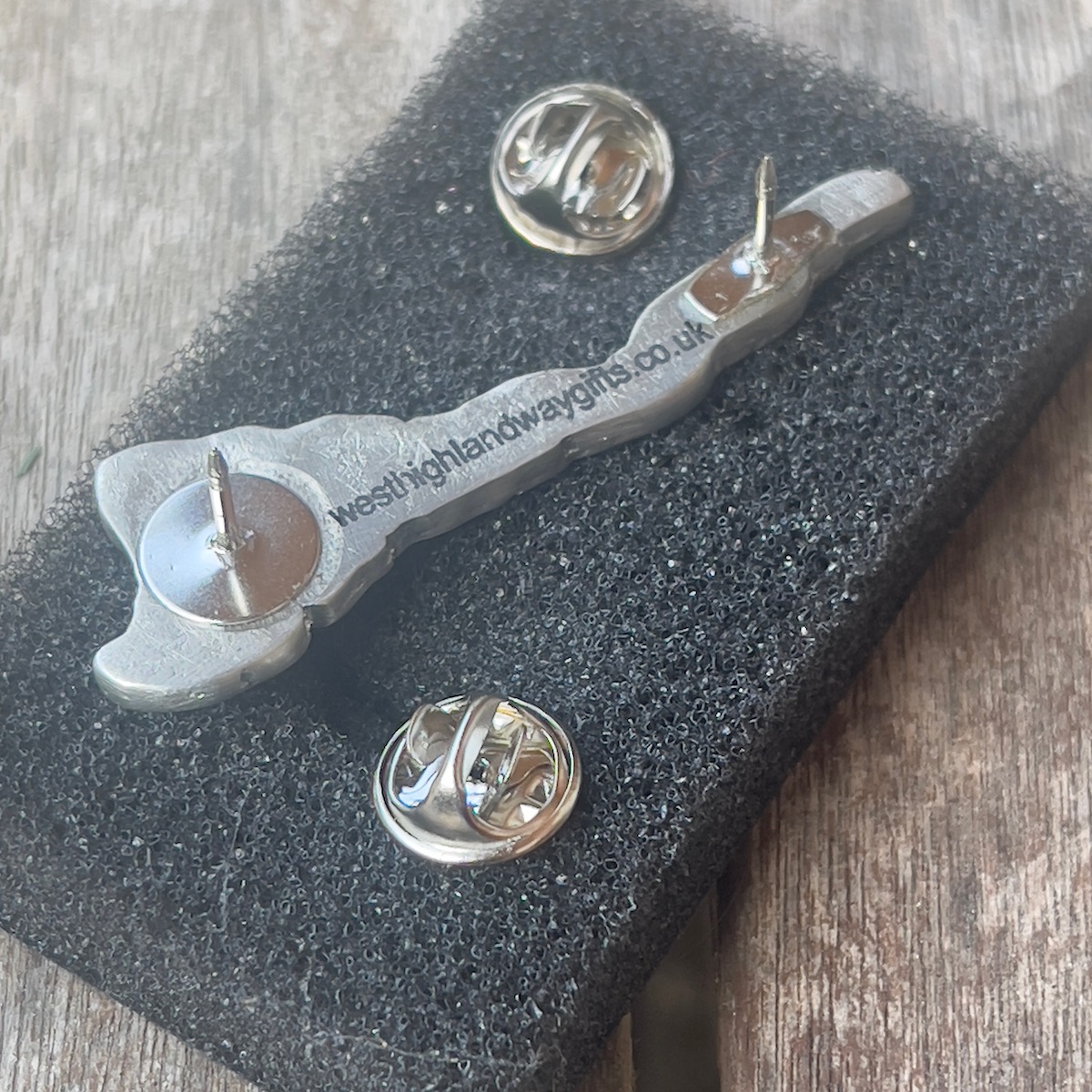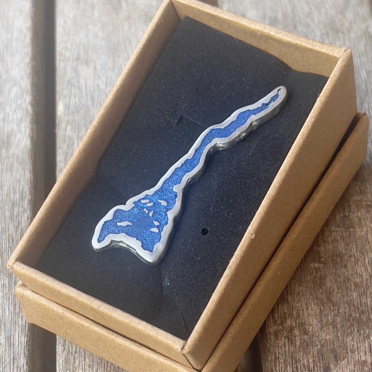 HAND-made Loch Lomond brooch/pin. Pewter and epoxy with two butterfly clasps on back.